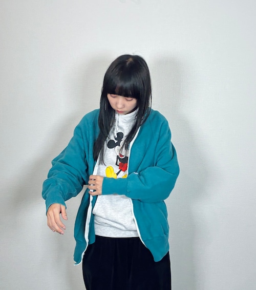 エメラルドグリーンに白のジッパーが映えており、他には存在しないであろう一点ものです。