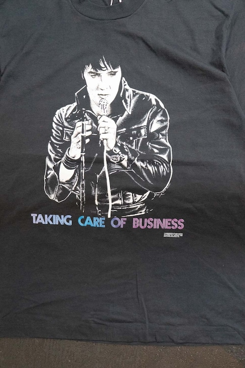 エルヴィスの決め台詞「TAKING CARE OF BUSINESS(仕事はきっちりやるぜ)」というメッセージがプリントされた一着。