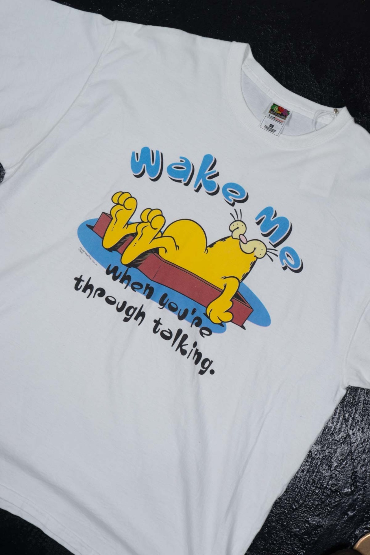 アメリカの人気コミックキャラクター「Garfield(ガーフィールド)」を彷彿とさせる、ユーモラスなプリントが印象的なヴィンテージTシャツ。