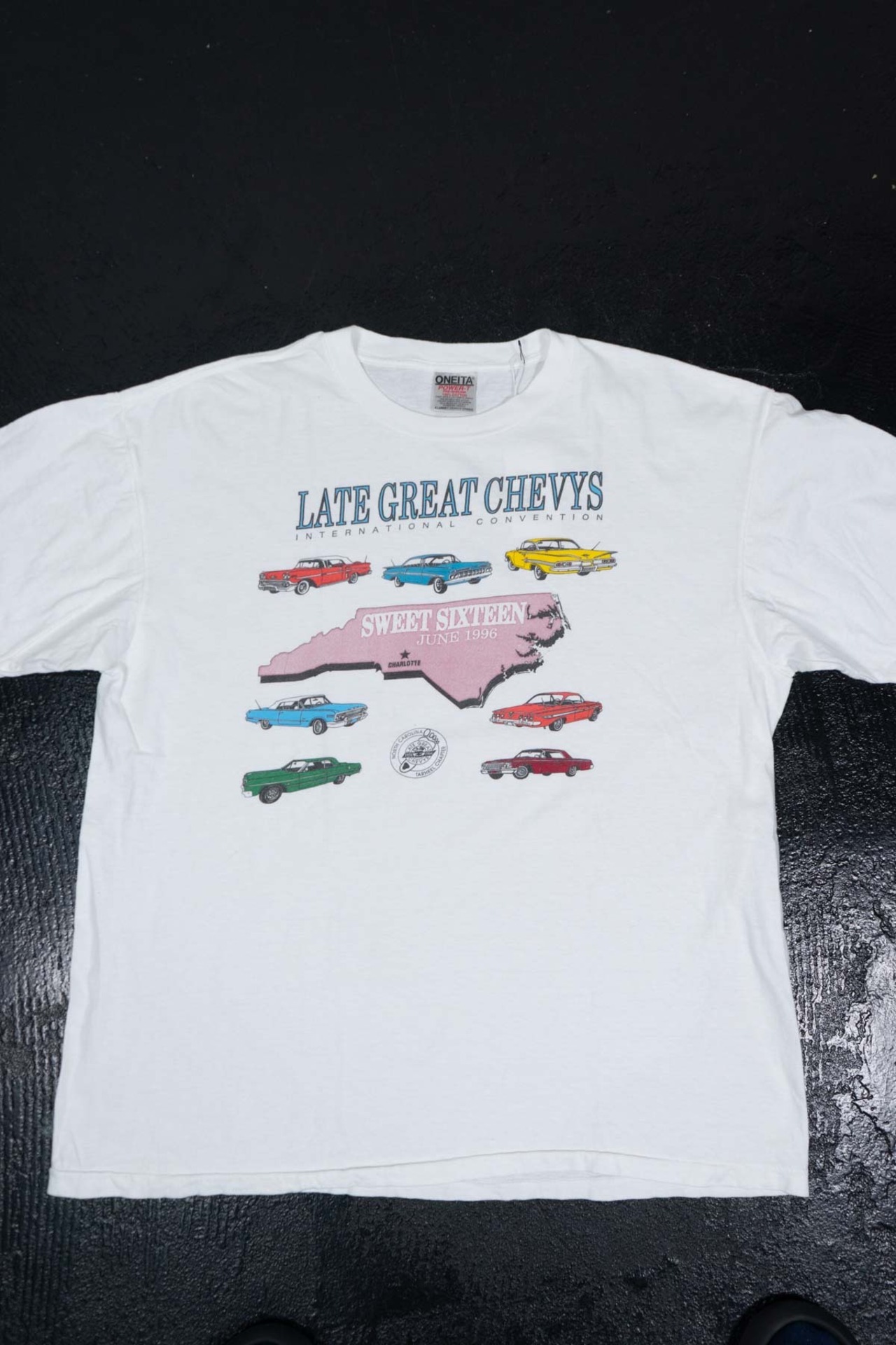 90's Vintage LATE GREAT CHEVYS Print Tee FABLIC MADE IN USA メンズ XL