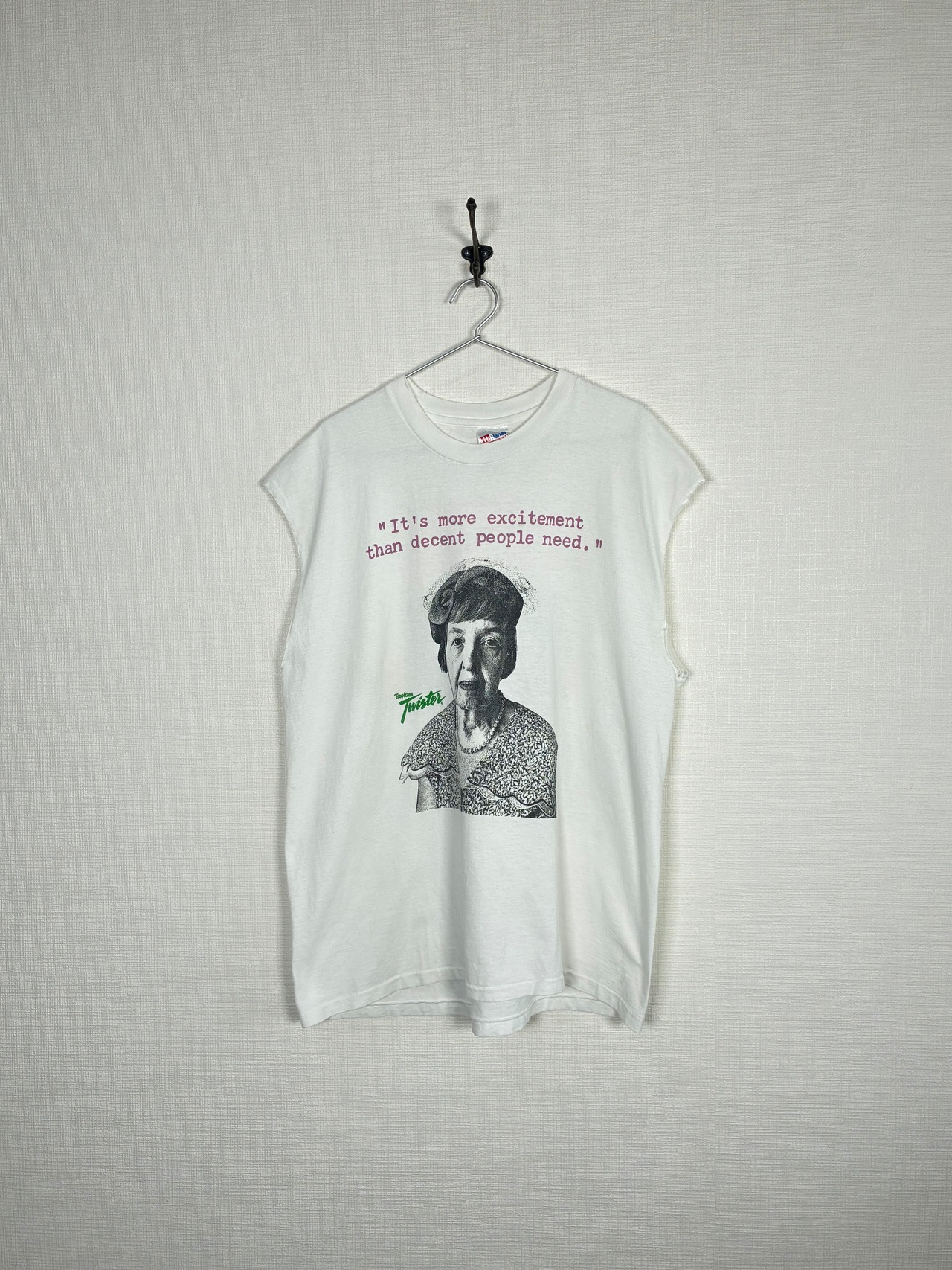 フロントにはユーモラスな婦人のモノクロプリントと、「It’s more excitement thidecent people need.」というアイロニカルなキャッチコピー、さらに「Twister」のロゴが配置された、90年代らしいユニークなデザインです。
