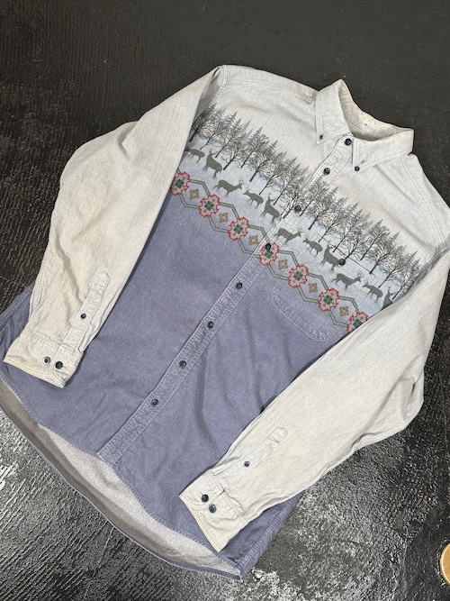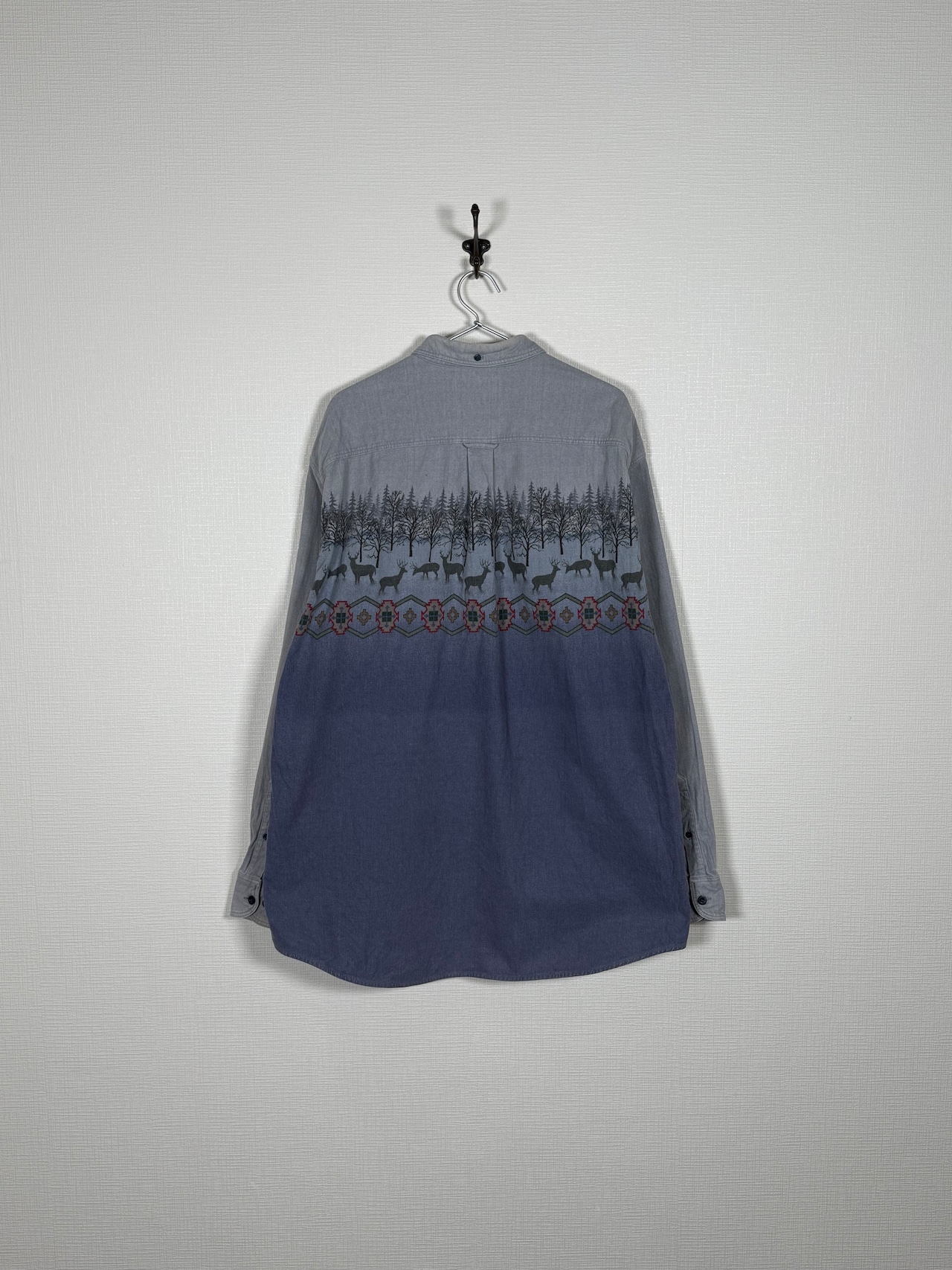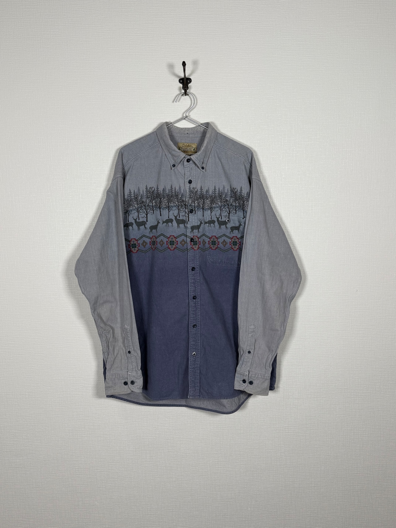 グレーベースのグラデーションに、鹿と森林モチーフの総柄プリント。