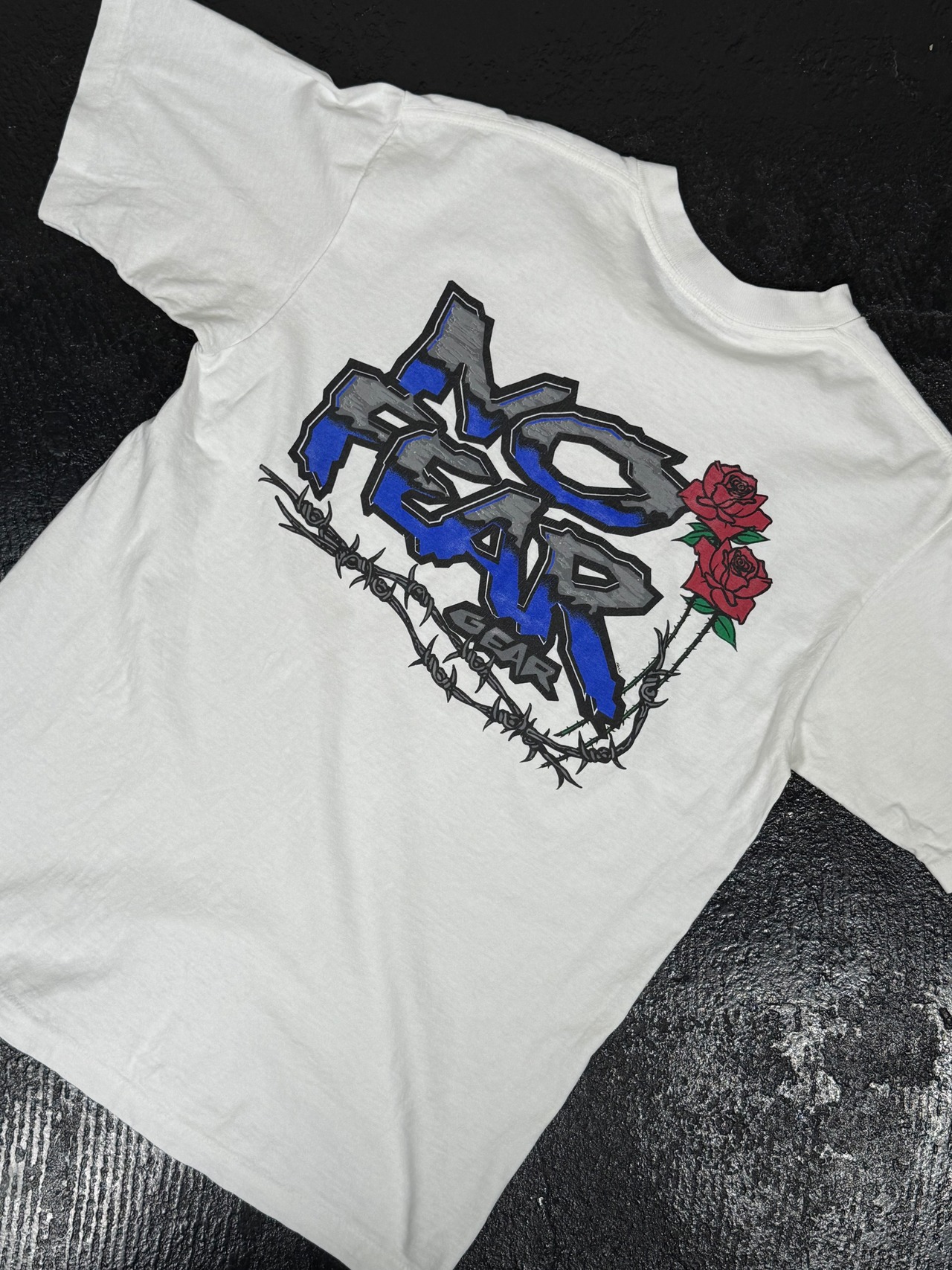 バックには立体的なブランドロゴに、有刺鉄線とローズを重ねた当時らしいハードなデザイン。