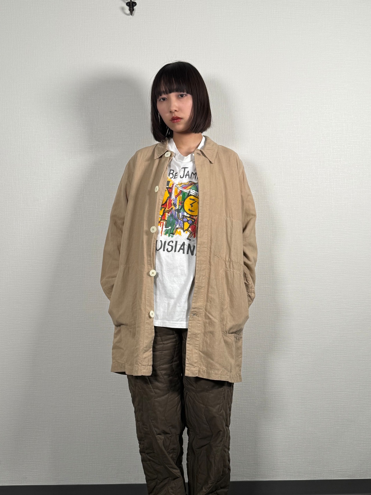 やや粗めのナチュラルな風合いの生地は、軽く羽織れるワークコートらしい質感。Tシャツやシャツの上からさらっと羽織るだけで雰囲気の出る一着で、カジュアルからヴィンテージスタイルまで幅広く活躍します。
