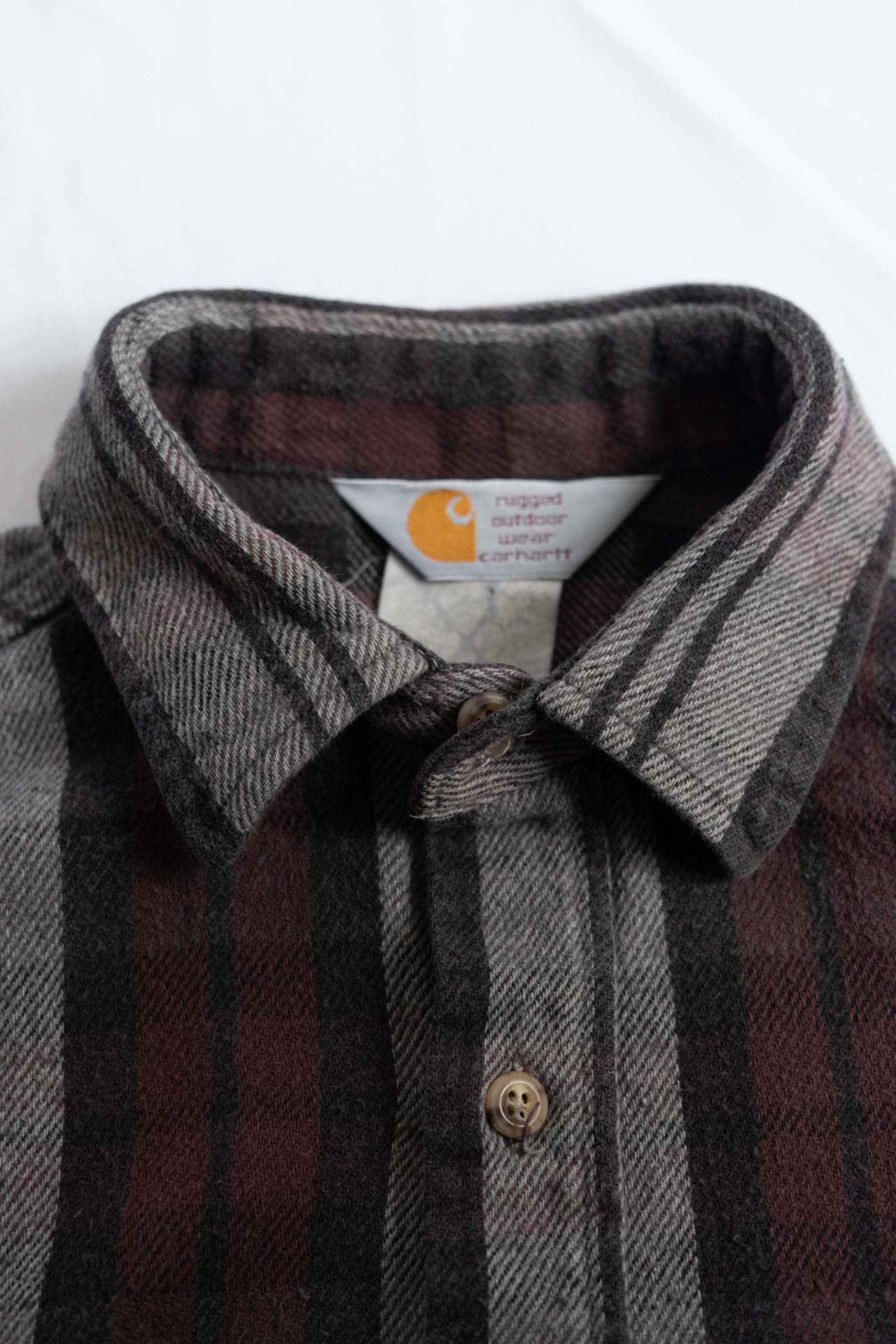 旧タグのカーハートのフランネルシャツ、落ちついた色合いでオールド感漂うアイテム。