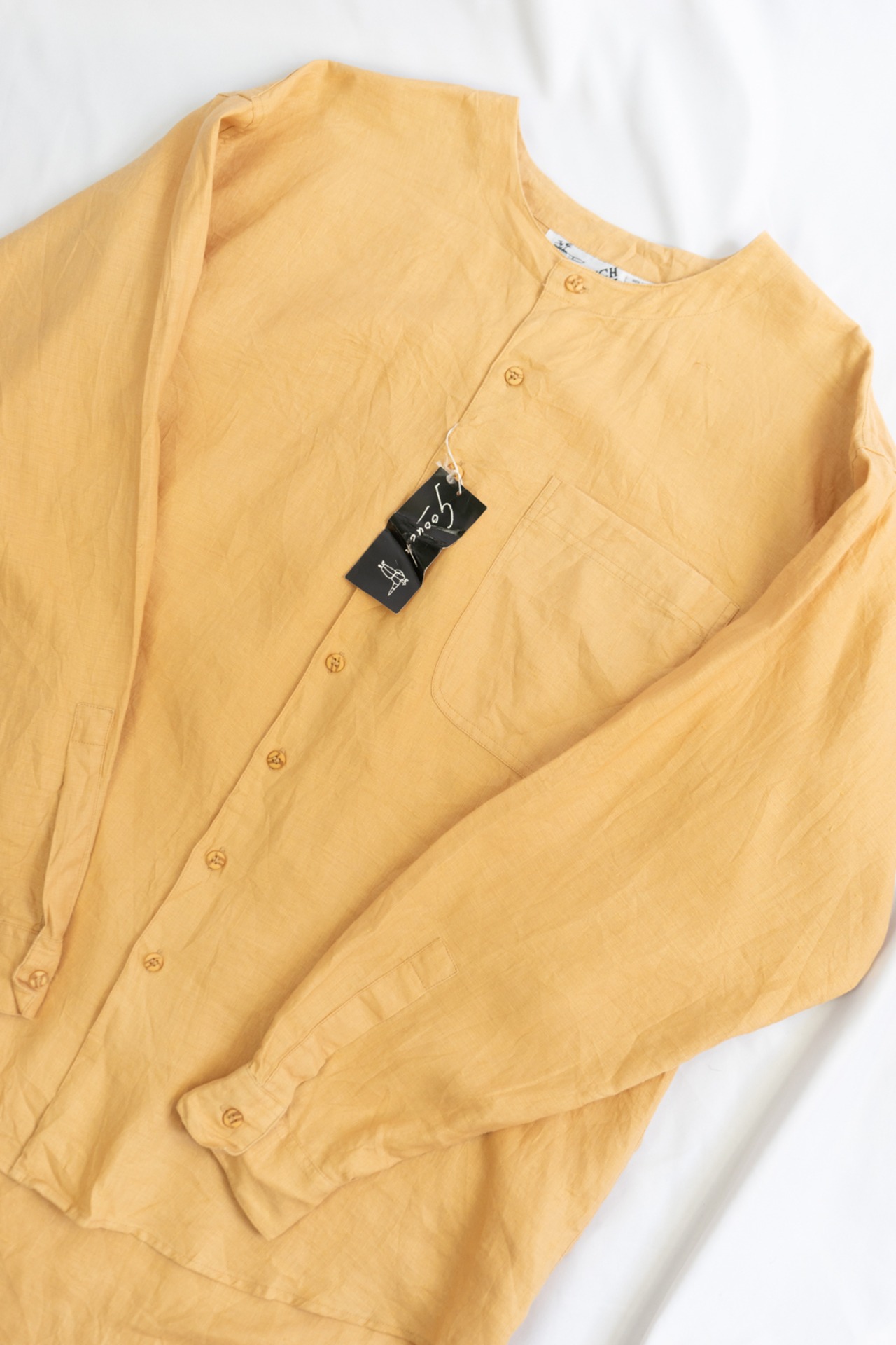 こちらはデッドストックのお品で、ノーカラーのざっくりシルエットのリネンシャツです。